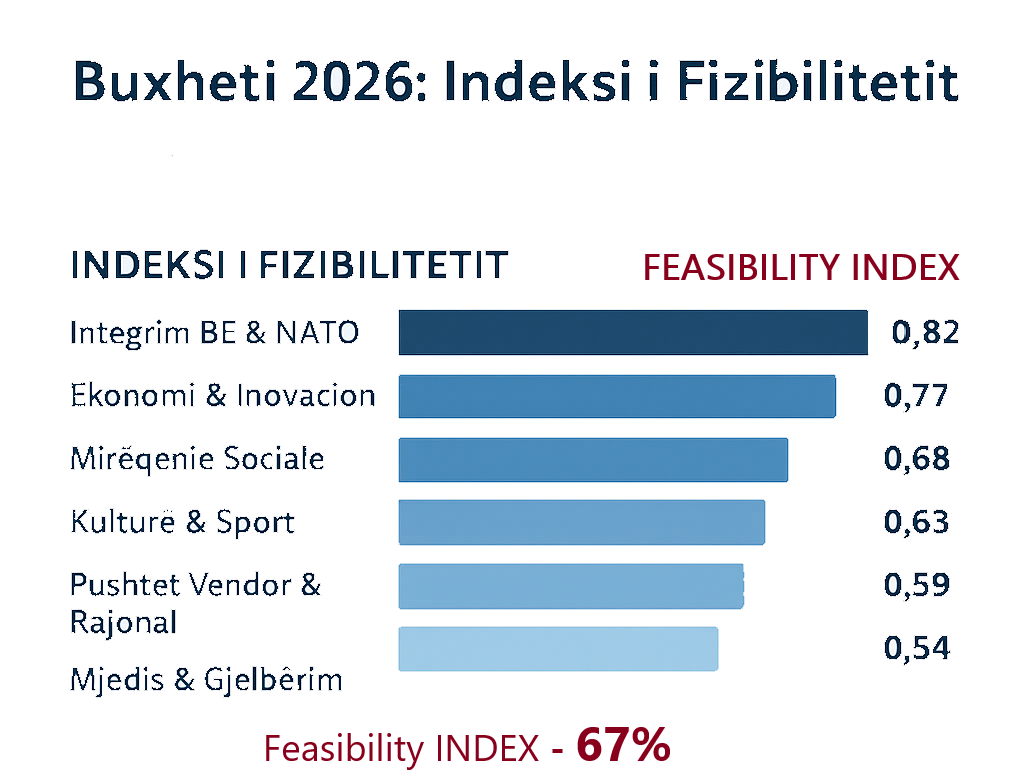 Indeksi i fizibilitetit për vitin 2026 arrin 0.67 (67%), duke shërbyer si një tregues kritik i realizueshmërisë së buxhetit krahasuar me objektivat politike dhe sociale. Ky rezultat tregon se më shumë se gjysma e objektivave janë të mbështetura financiarisht dhe të zbatueshme, por një pjesë e konsiderueshme mbetet e pambuluar ose e varur nga faktorë të jashtëm, si fonde nga BE, reforma ligjore ose partneritete private.